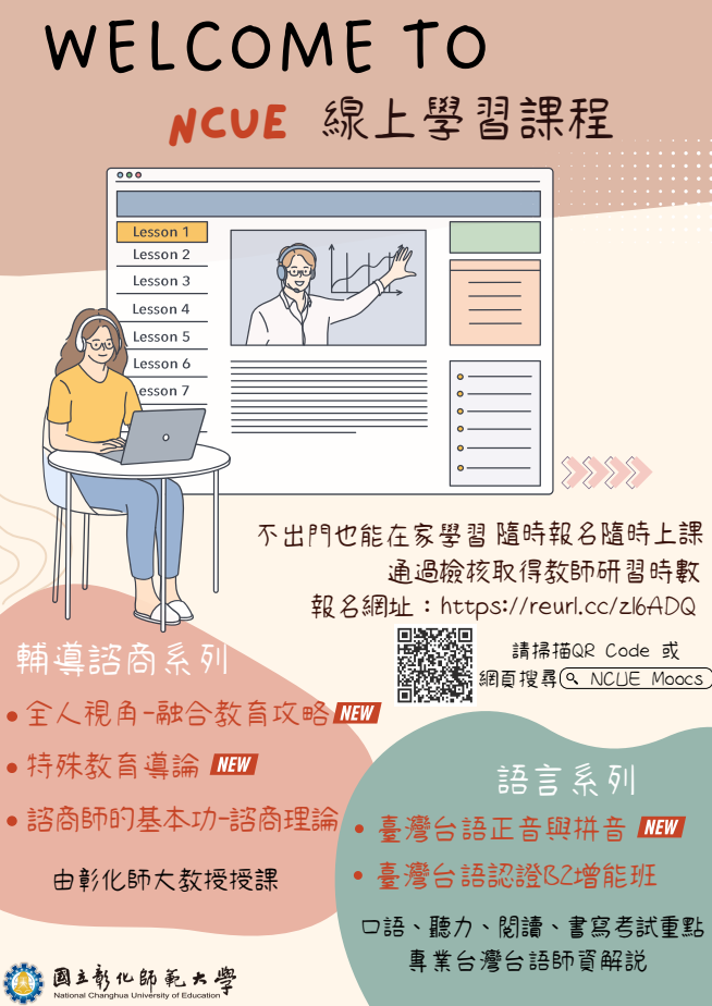 國立彰化師範大學 推廣教育「精緻Moocs系列課程」之「全人視角-融合教育攻略」、「特殊教育導論」、「臺灣台語正音與拼音」、「臺灣台語認證B2增能班」、「諮商師的基本功-諮商理論」等數位課程招生。 如有課程相關問題,請向本校教務處數位學習組洽詢:04-7232105 分 機 1776 蘇 小 姐 , E-mail :suyujui@gm.ncue.edu.tw。 說明: 一、 由本校教務處數位學習組、進修學院共同規劃線上非學分班數位學習課程,學員依規定完成線上數位課程後,將頒發國立彰化師範大學「精緻Moocs 系列課程研習證書」,若具有教師資格本校會自動在全國教師在職進修網登錄研習時數。 二、 精緻Moocs系列課程之招生簡章,請詳網站說明(https://reurl.cc/zl6ADQ)。 三、 課程時間:完成繳費後,自指定開課日起算21天,不限時段,隨時至本校雲端學院上課。 四、 課程費用:請參閱各課程簡章。 五、 報名時間:即日起至115年1月31日止,隨報名隨開班。 六、 線上報名連結:https://reurl.cc/zl6ADQ。 七、 報名方式及其他課程資訊請詳閱各課程招生簡章。 八、