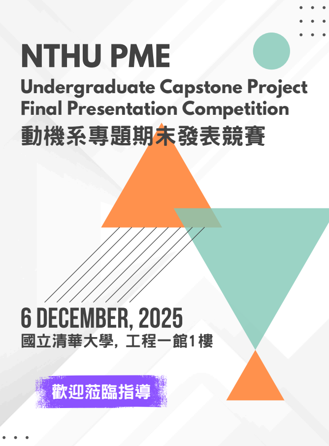 主旨: 本校動力機械工程學系(下稱本系)訂於114年12月6日(星期六)上午9時至12時於本校工程一館1樓舉辦「114年度大學部專題研究期末發表會」,敬邀貴屬師生蒞臨參觀,請查照轉知。 說明: 一、 旨揭活動為本系大學部四年級學生研修「專題研究」課程之公開成果發表,計42組作品參展,發表主題包含機器人、生醫晶片、機械手臂、無人機及賽車製造技術等,如有興趣瞭解本系所學及學生實作應用,歡迎蒞臨參觀。 二、 檢附活動海報電子檔1份,敬請協助公告及轉知。