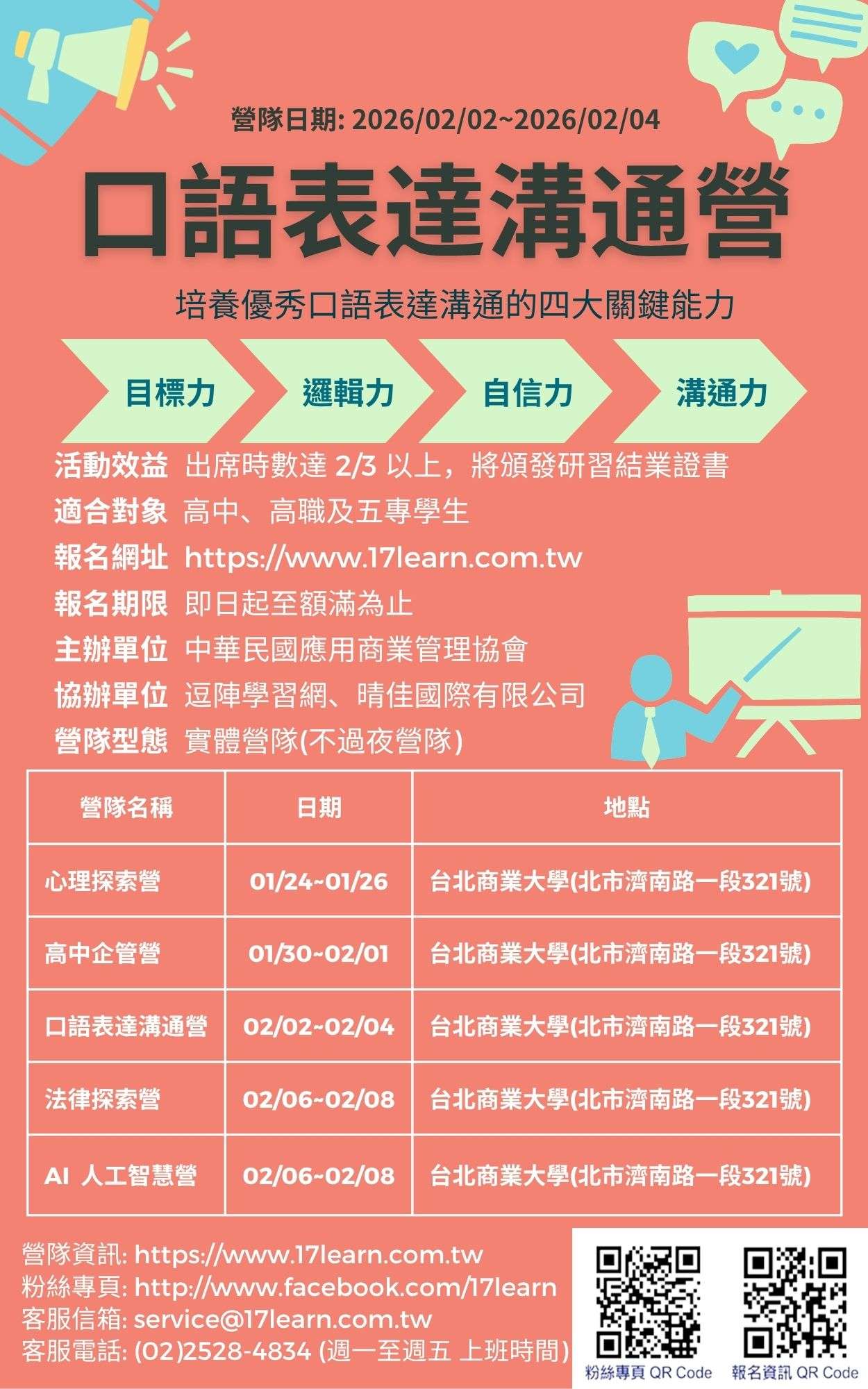| 說明: | 無論是升學口試或求職面談,口語表達已經是現代人不可或缺的能力。「口語表達溝通營」透過講解、示範、訓練和不斷的演練,克服公開發言的恐懼,人人都可以成為口語表達的高手! |