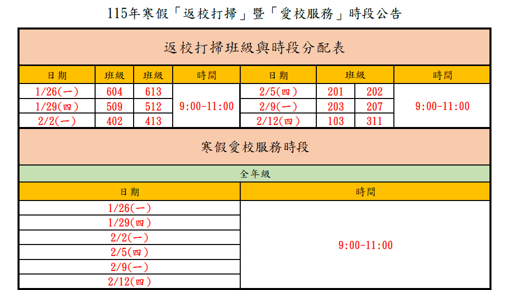 2.若返校打掃無法到,需至衛生組請假並補打掃(寒假返校時段)。