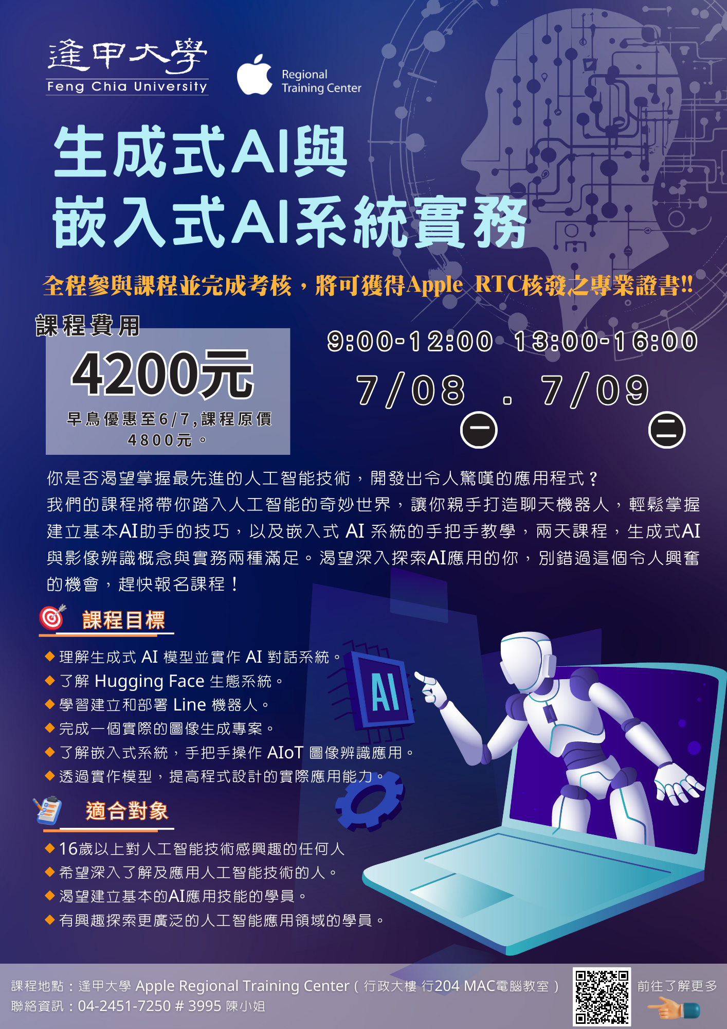 逢甲大學Apple RTC區域教育培訓中心謹訂於113年7月8日至7月9日辦理「生成式 AI 與嵌入式AI系統實務」課程