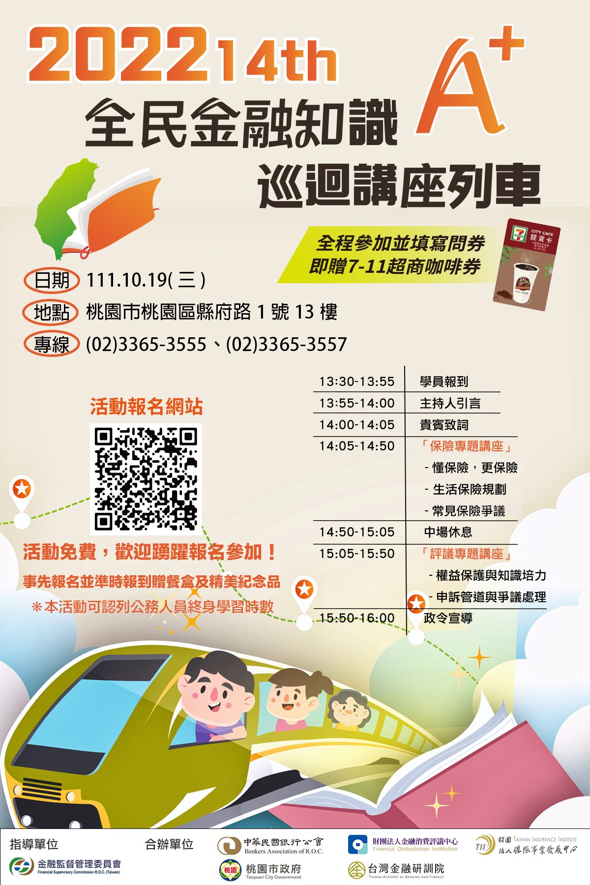 | 三、 | 本活動訂於111年10月19日(三)下午1時30分至4時30分,假本府公務人力培訓中心(地址:桃園市桃園區縣府路1號13樓)舉行,內容包括「懂保險,更保險」、「金融消費停看聽 自我權益先認清」及「永續金融、樂齡理財 及性別平等政策宣導」(含有獎徵答)。 |