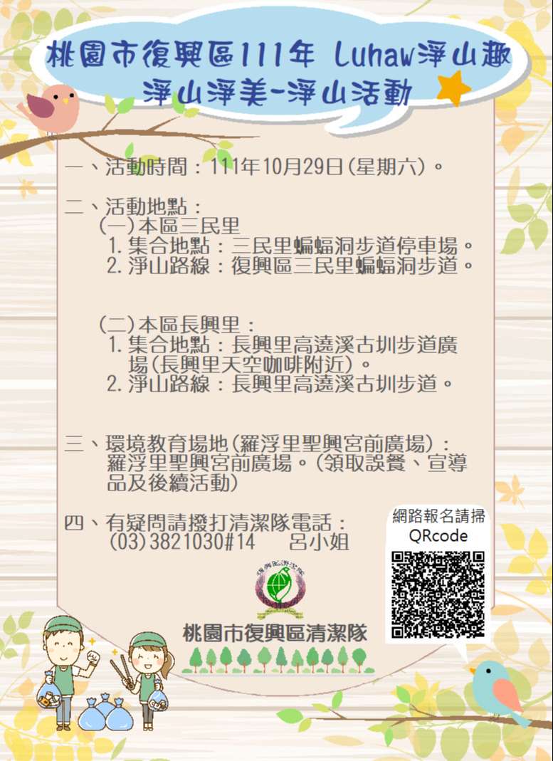 | 三、 | 有意報名者請至「本公所網站─最新消息─桃園市復興區公所111年Luhaw淨山趣•淨山淨美-淨山活動報名」內網路報名或擇紙本傳真報名;另本活動建議需家長(監護人)陪同,如無請填寫家長(監護人)同意書併同報名表傳真至本公所清潔隊(03-3821189)。 |