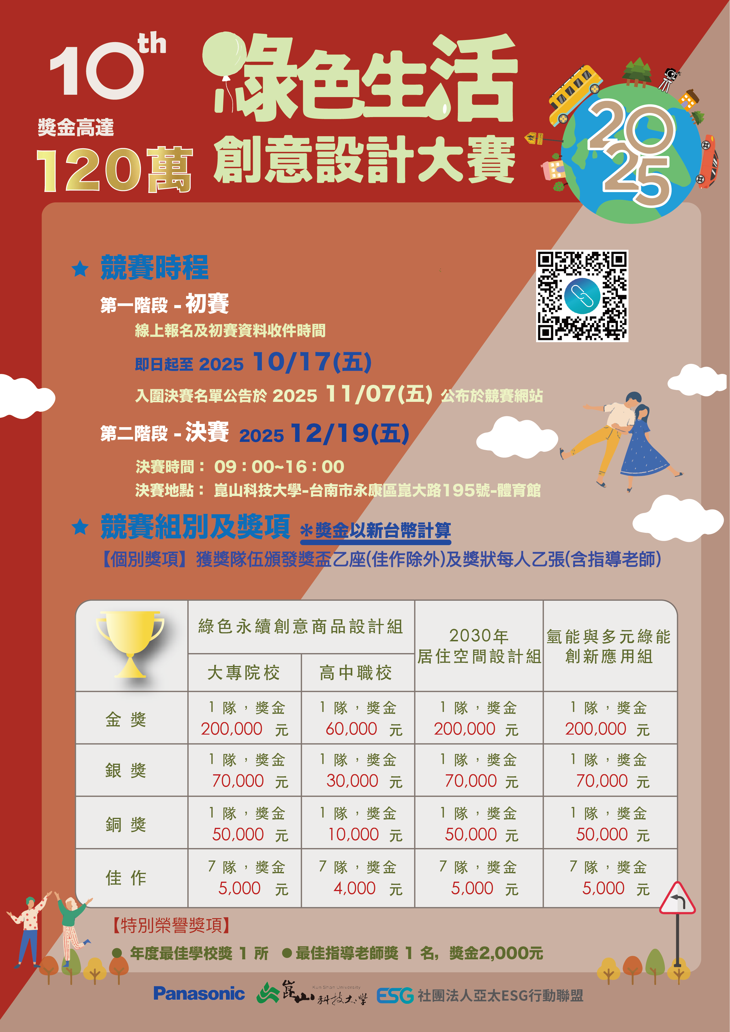 說明: 一、 台灣Panasonic集團自2015年每年定期舉辦「綠色生活創意設計大賽」,本校延續前九屆綠色生活創意設計大賽精神舉辦「第十屆2025 綠色生活創意設計大賽」,讓創造美好生活的核心精神從校園、城市開始深化,激發學子們對「淨零碳排與智慧低碳生活、永續能源」,共同建立永續的未來。 二、 辦理單位:主辦單位-台灣Panasonic集團;承辦單位-崑山科技大學;協辦單位-社團法人亞太ESG行動聯盟。 三、 報名時間:即日至114年10月17日止受理報名。 四、 報名方式:參賽隊伍必須先至「第十屆2025 綠色生活創意設計大賽」網站下載競賽簡章:https://greenlife.ksu.edu.tw/,如附件一所示。 五、 競賽聯絡人:賴榮彬專案經理,電話:06-272-7175#540,電子信箱:panasonicksu@gmail.com 六、 檢送本案競賽簡章和海報各1件。