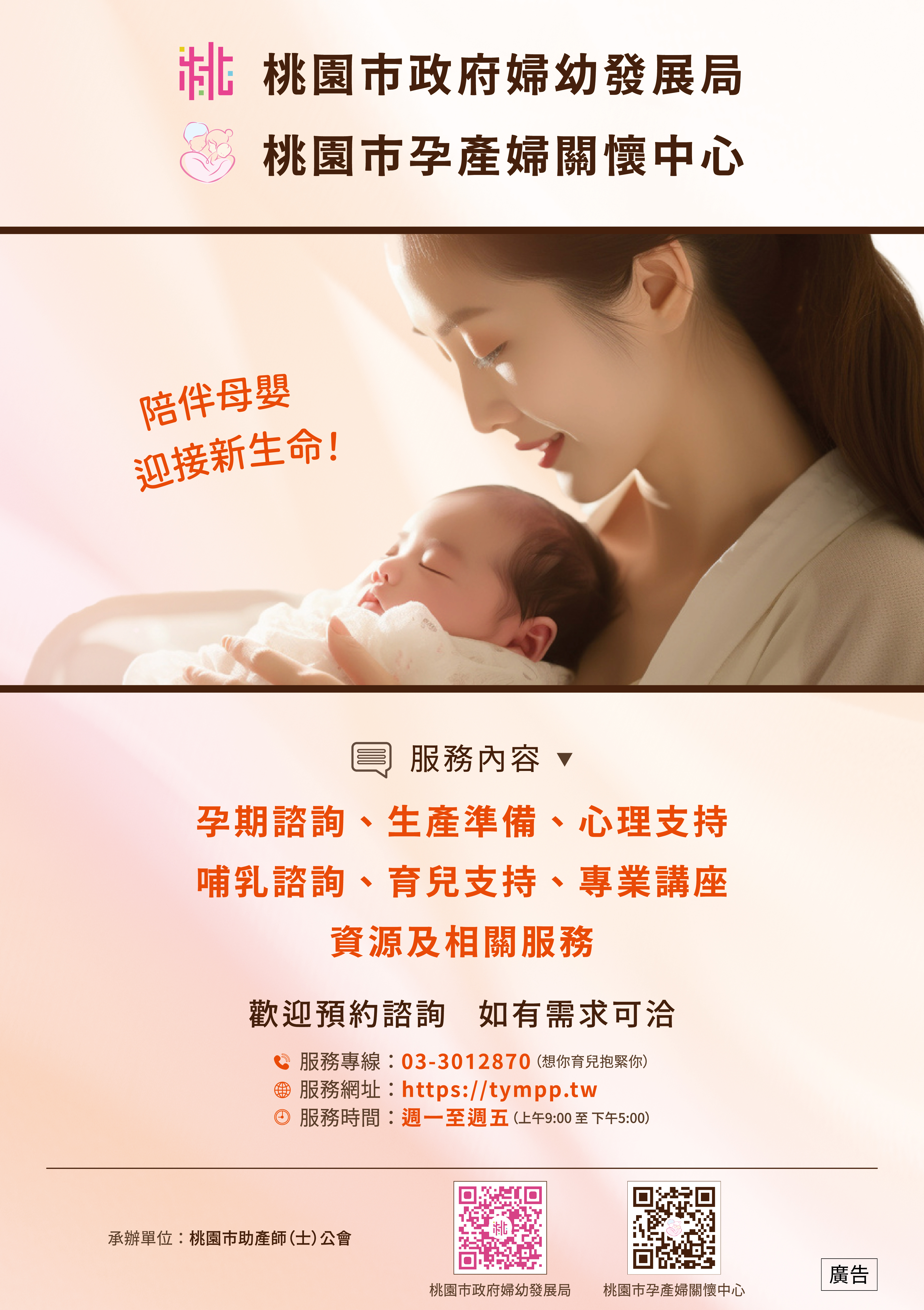 | 本案相關宣導海報業已公告於本府婦幼發展局網站(網址:https://dowcd.tycg.gov.tw/),請逕由「首頁>業務服務資訊>健康管理服務>孕產婦健康專區>孕產婦全方位守護」下載使用。 |