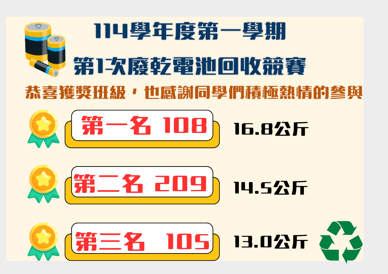 114-1第一次廢乾電池回收競賽恭喜前三名的班級:108-16.8kg