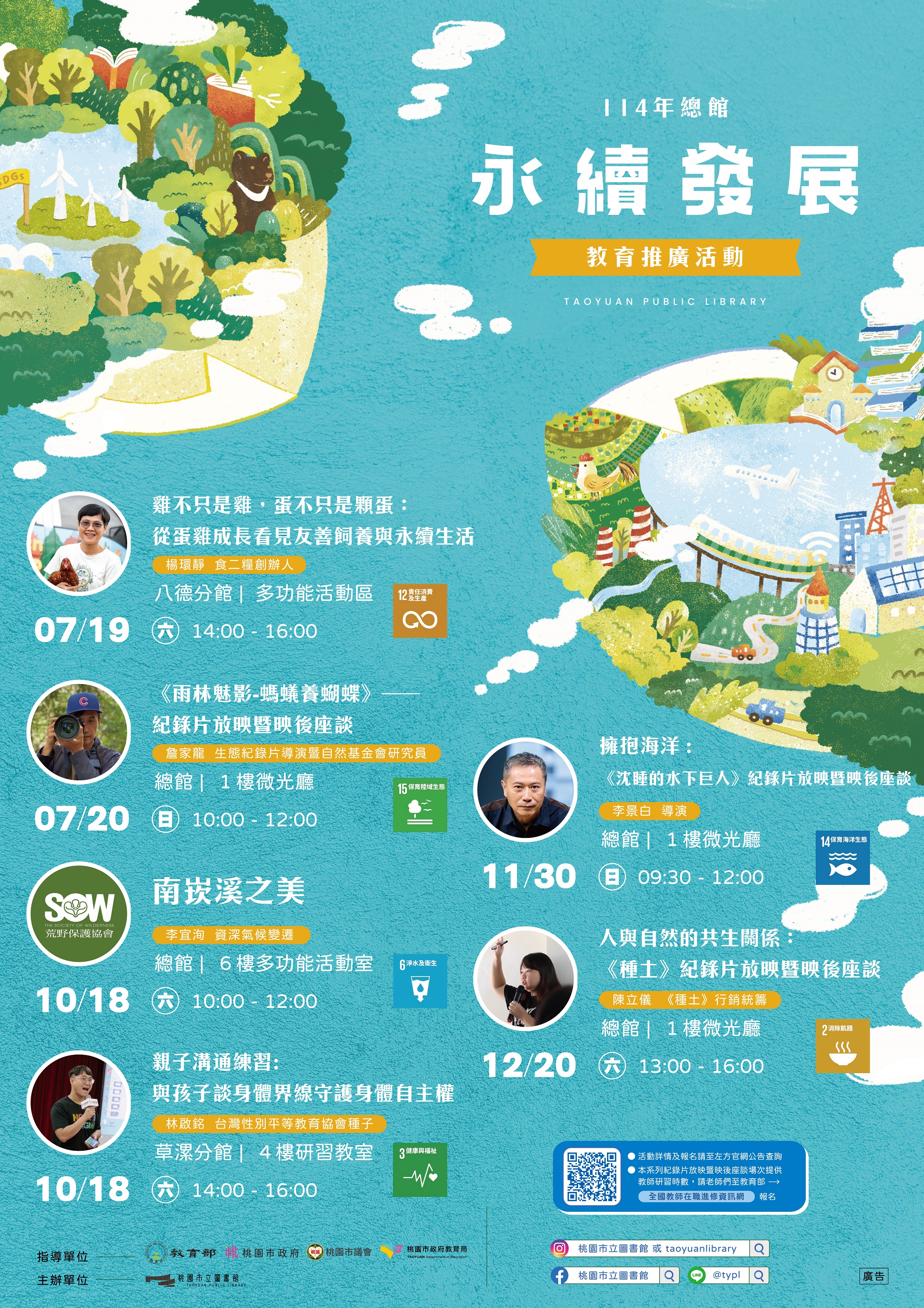 說明: 一、 本案藉由放映環境生態紀錄片並搭配映後座談,以及講座的 形式,配合相關書籍,帶領社會大眾了解何為SDGs分類所 涉及的相關議題,教育民眾以自身出發,響應永續發展計畫。 二、 本系列「紀錄片放映暨映後座談」場次,提供教師研習時數,請教師們至全國教師在職進修資訊網報名。 三、 詳情及報名請至本館官網(https://www.typl.gov.tw/zh-tw/Activity/Content/6659)查詢,或洽承辦窗口(03)316-6345#4007林小姐。